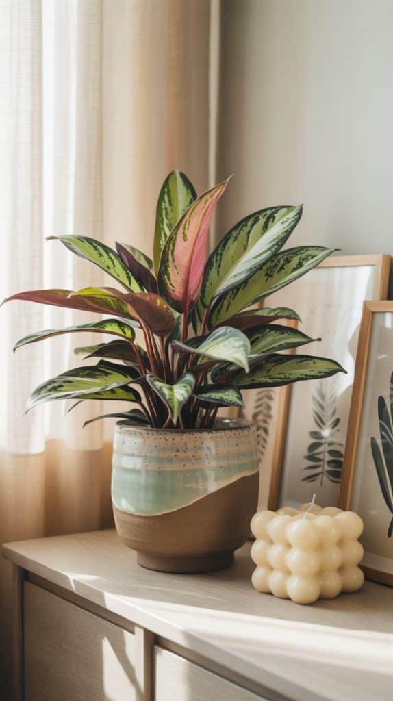 With its colorful variegated leaves, the Chinese Evergreen brightens up low-light spots. It’s one of the most adaptable houseplants and tolerates neglect with grace.