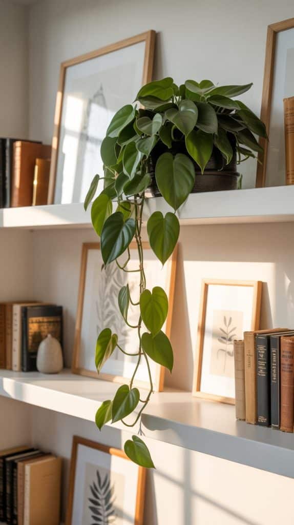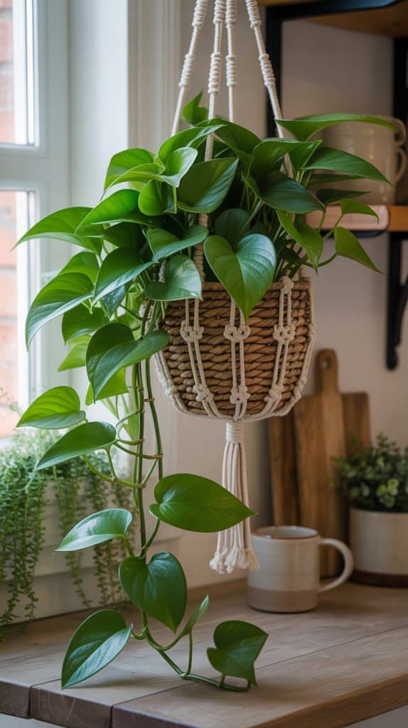 Pothos is a forgiving vine that grows beautifully even in dim light. Its trailing leaves look stunning from a hanging basket or shelf.