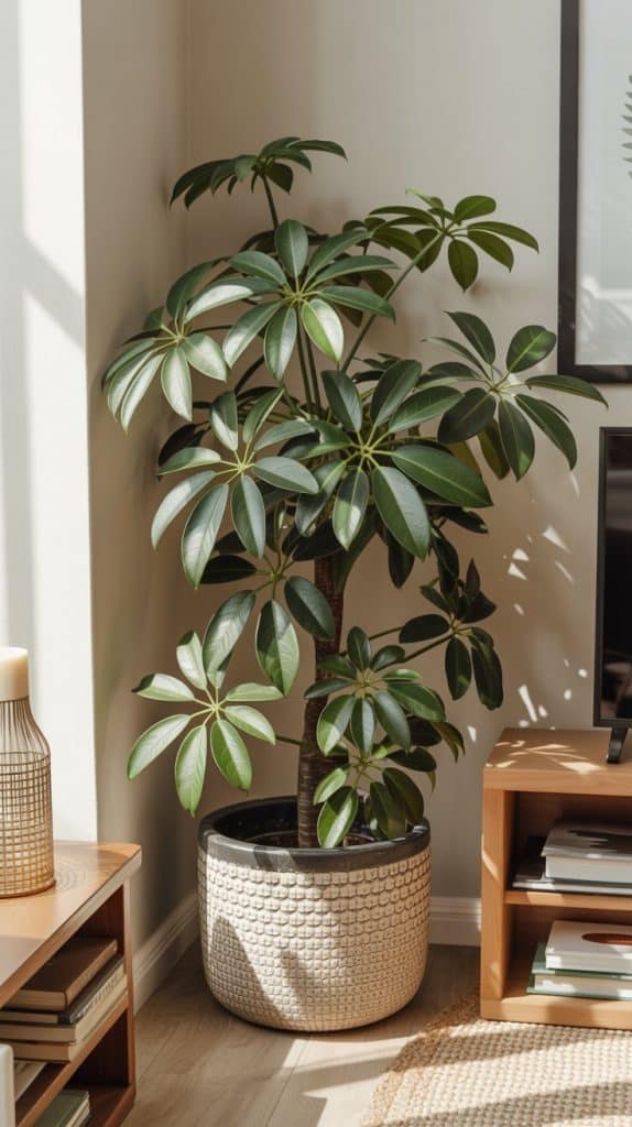 Named for its umbrella-like clusters of leaves, this hardy houseplant is easygoing and fast-growing. It adapts well to indoor light and doesn’t mind drying out a bit between waterings.